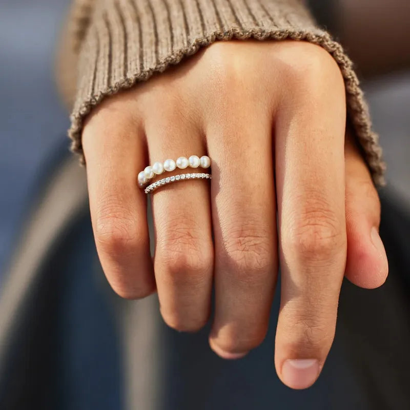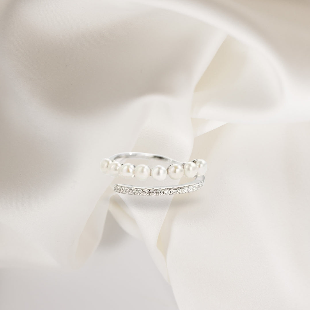 Prstan Ella odlikuje klasična oblika z dvema ravnima linijama, eno linijo oblikujejo bleščeči cirkoni, drugo linijo oblikujejo biserčki. Prstan je natančno oblikovan s tesno razporejenimi cirkoni in biserčki za neprekinjen lesk in eleganco. Notranji obroč je gladko poliran, da se zagotovi dolgotrajno udobje.