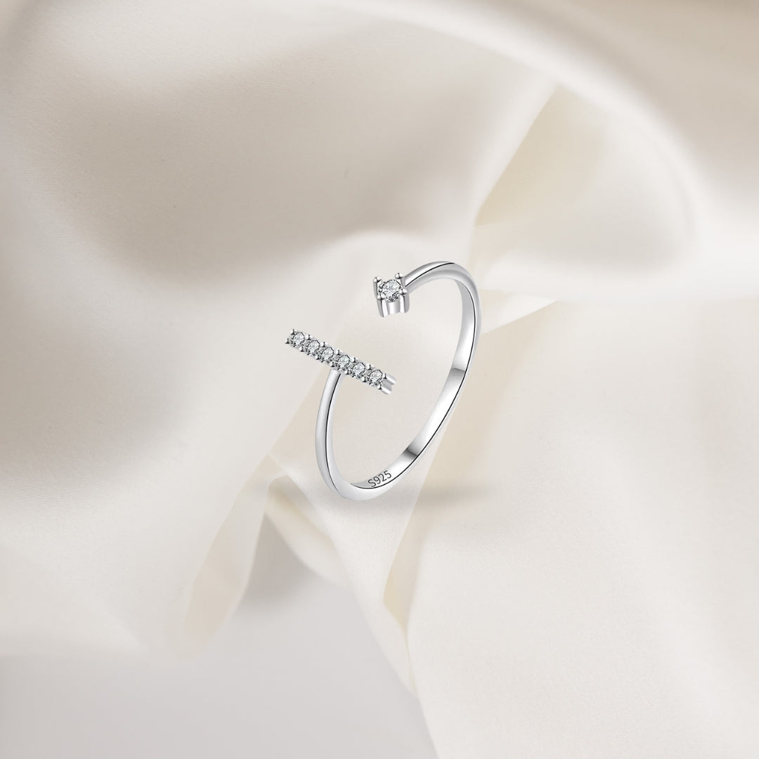 Prstan Evie odlikuje klasična oblika z ravno linijo bleščečih cirkonov na eni strani ter enim bleščečim cirkonom na drugi strani. Prstan je natančno oblikovan s tesno razporejenimi cirkoni za neprekinjen lesk in eleganco. Notranji obroč je gladko poliran, da se zagotovi dolgotrajno udobje.