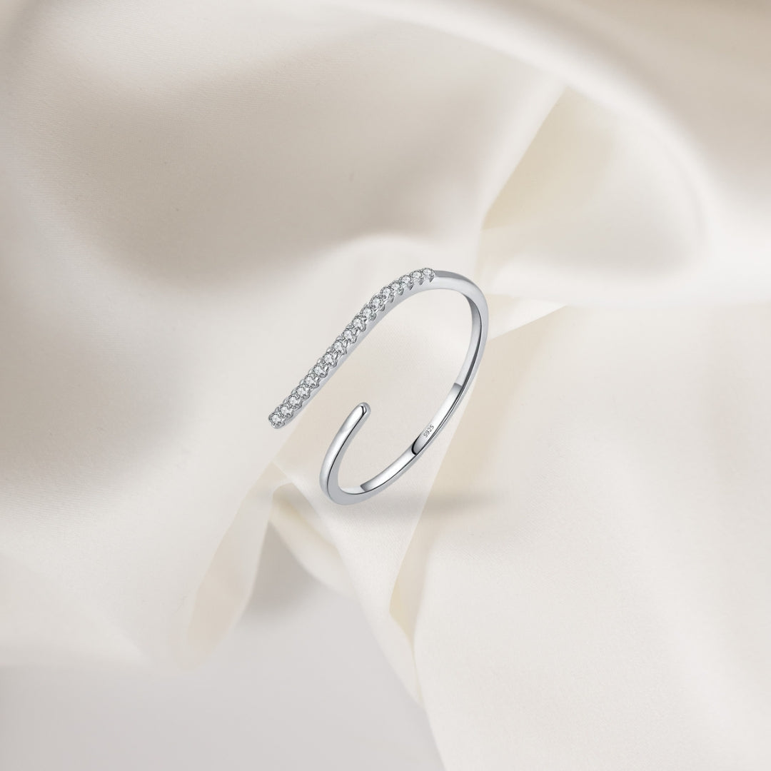 Prstan Grace odlikuje klasična oblika z ravno linijo, ki jo oblikujejo bleščeči cirkoni. Prstan je natančno oblikovan s tesno razporejenimi cirkoni za neprekinjen lesk. Notranji obroč je gladko poliran, da se zagotovi dolgotrajno udobje.
