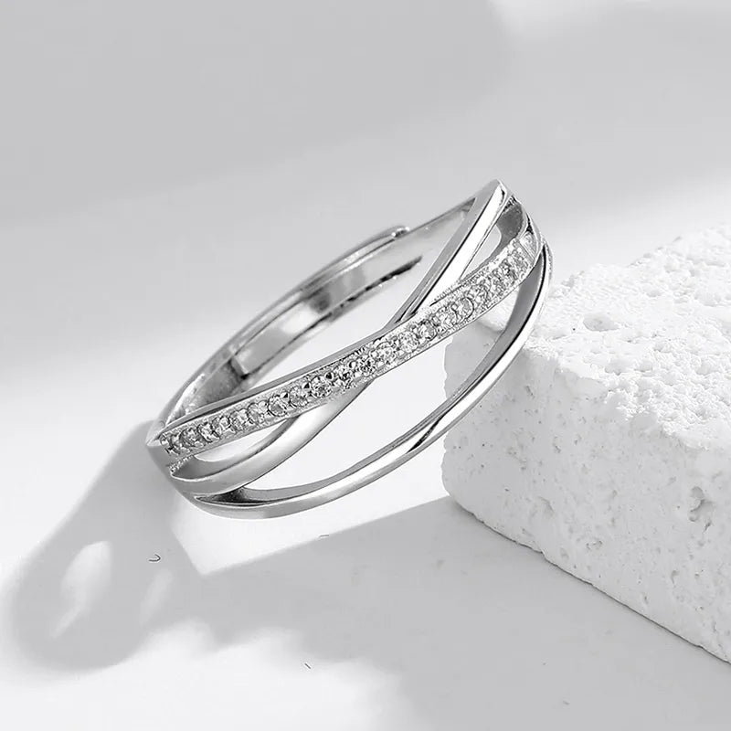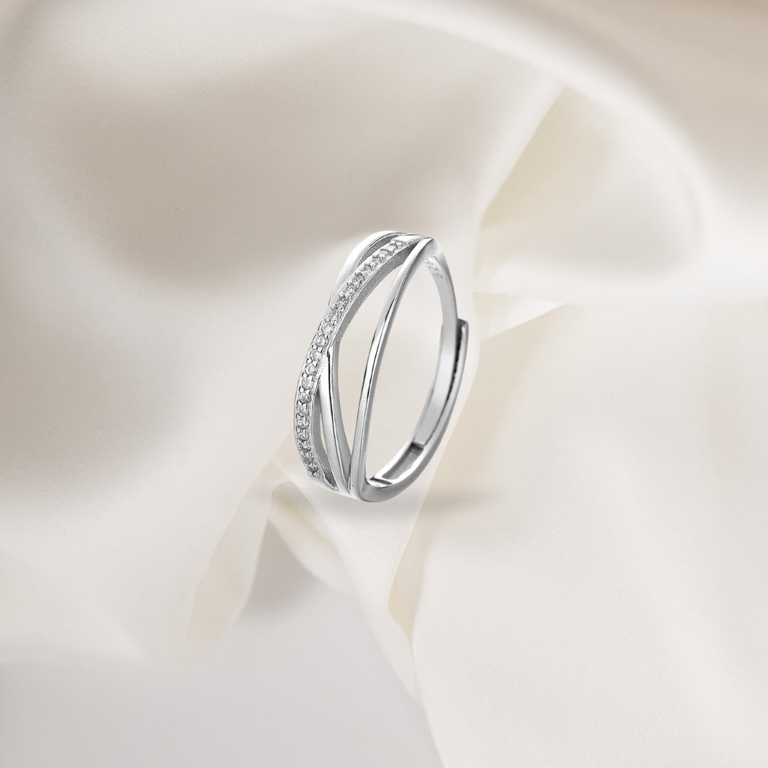 Prstan Ivy odlikuje klasična oblika z ravnimi linijami, z dvema klasičnima in eno linijo z bleščečimi cirkoni. Prstan je natančno oblikovan s tesno razporejenimi cirkoni za neprekinjen lesk in eleganco. Notranji obroč je gladko poliran, da se zagotovi dolgotrajno udobje.