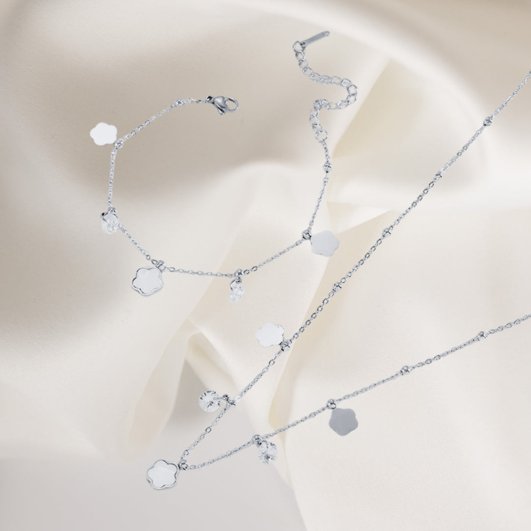 Kolekcija nakita, polna šarma in prijetnega pridiha. Vsak kos nakita je osredotočen na bogato obarvano belo rožico, uokvirjeno z zlatim ali srebrnim, zapleteno teksturiranim okvirjem. Ta kolekcija vključuje verižico in zapestnico.