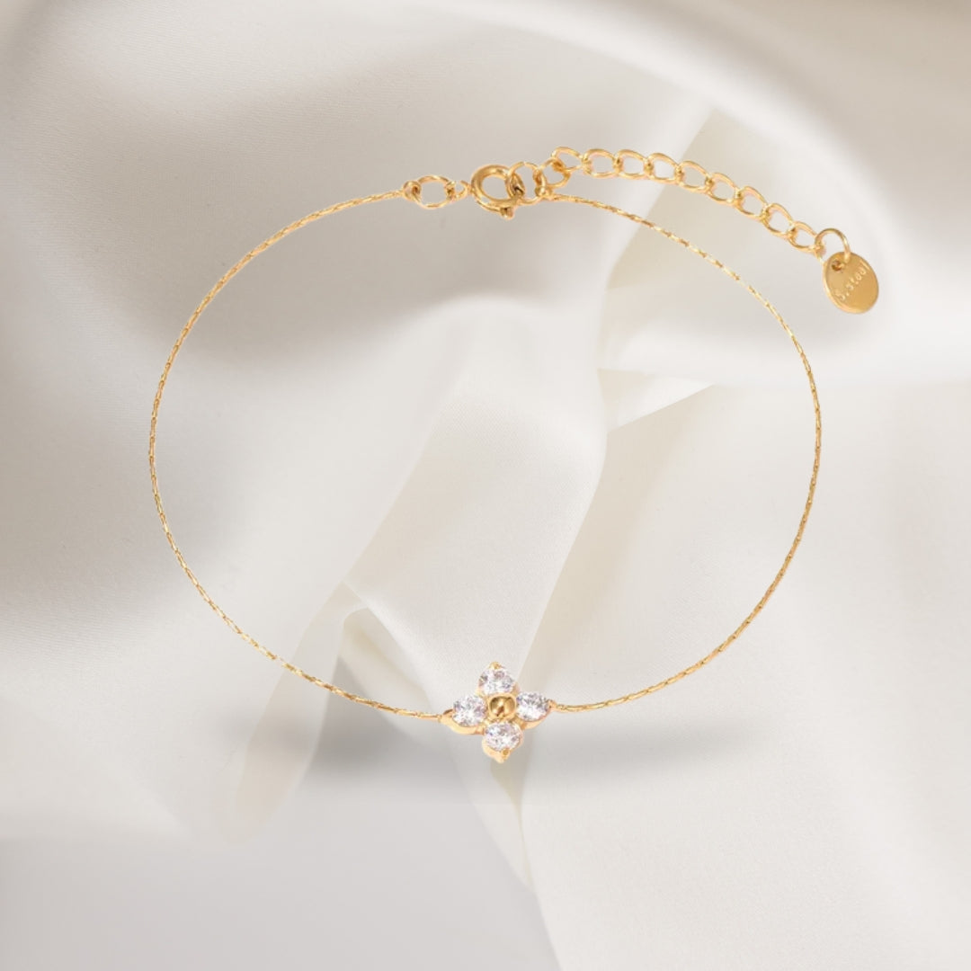 Tanka zapestnica z osrednjim obeskom v obliki deteljice z barvnimi cirkoni. Poskusite jo nositi samostojno za nežen pridih pomena in blišča, idealna za vsakodnevno nošenje. Prav tako se lepo kombinira s preprostimi verižicami ali uro, da ustvarite zaščitni in eleganten komplet za zapestje.