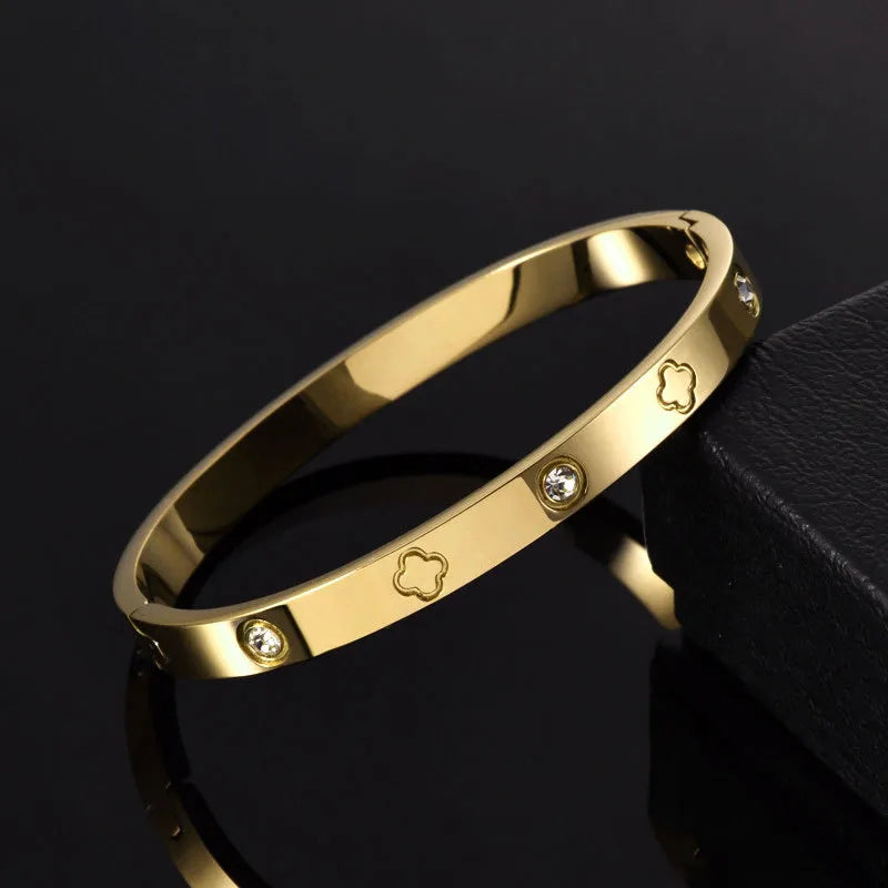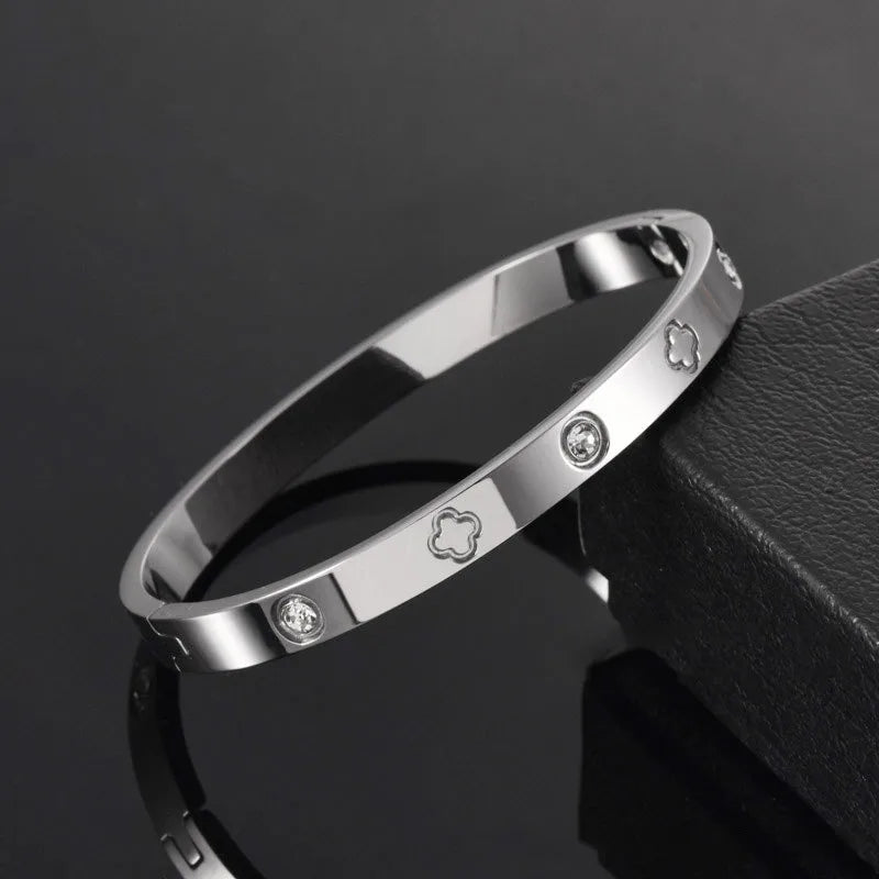 Zapestnica Violet je klasična zapestnica s tečaji. Sprednji del ima ponavljajoč se geometrijski vzorec deteljce, ki se izmenjujejo z majhnimi, okroglimi cirkoni za resnično prijeten občutek. Ta zapestnica je že sama po sebi močan kos opreme. Nosite eno samo manšeto, da svojemu vsakodnevnemu videzu dodate pridih razkošja, ali pa kombinirajte več barv za drzen in glamurozen učinek.